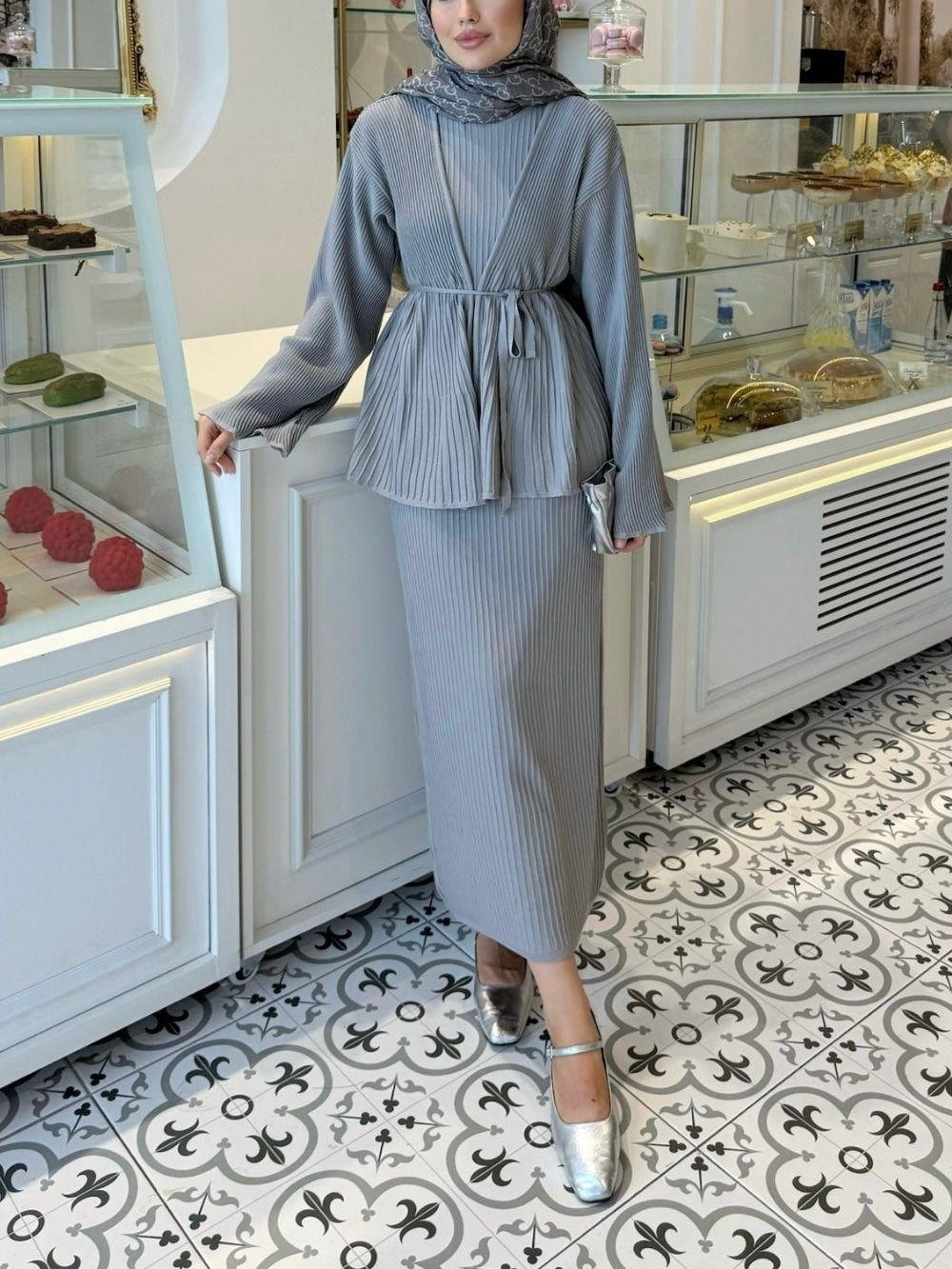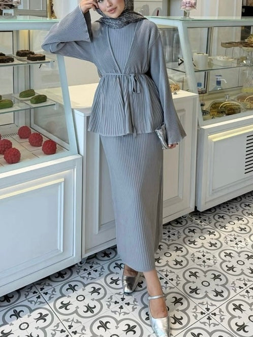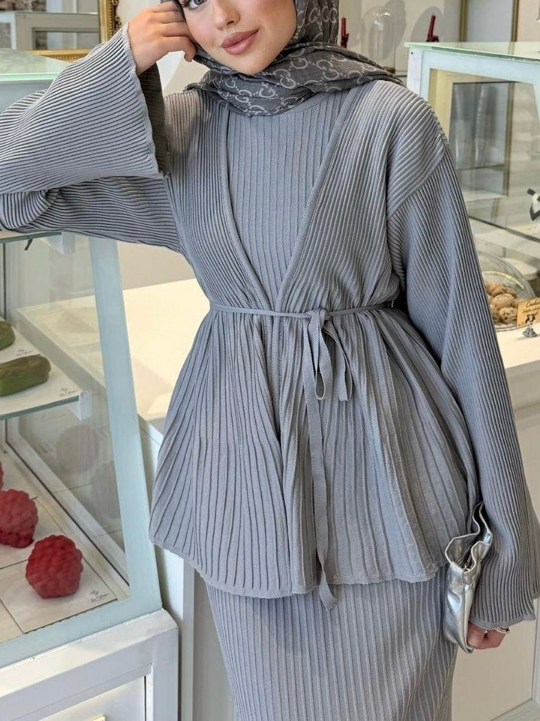طقم فستان و جكيت مصوف رمادي